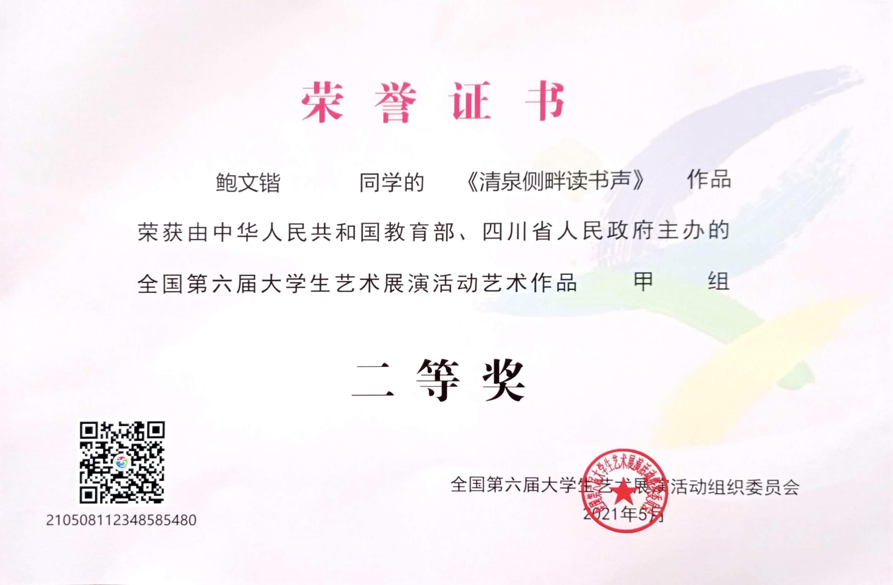 本网讯(通讯员:杨蕊)5月12日,全国第六届大学生艺术展演在四川省成都市顺利落下帷幕。贝博官网艺术学院江健龙副教授指导石锦豪同学的书法作品《晁错论》、王维华副教授指导鲍文锴同学的绘画作品《清泉侧畔读书声》荣获全国二等奖的佳绩。