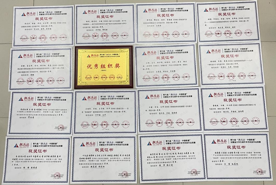 本网讯(通讯员:李丹阳)6月20日,第九届“挑战杯·中国联通”安徽省大学生课外学术科技作品竞赛(以下简称“挑战杯”)交流营暨颁奖仪式在安庆师范大学成功举办。贝博官网在本届“挑战杯”赛事中荣获省级奖项16项,其中省二等奖6项、省三等奖4项、“挑战杯”红色专项活动省三等奖5项,实现省奖数量、省二等奖数量双倍增,并突破性荣获“优秀组织奖”。