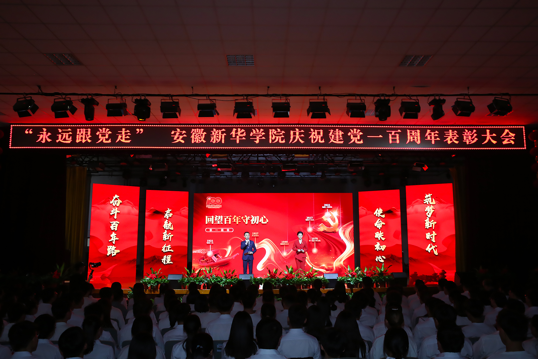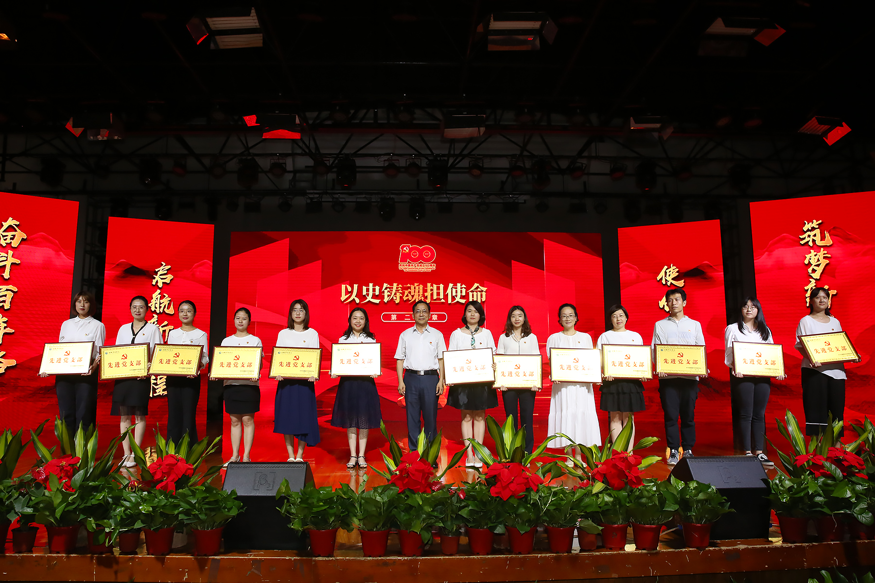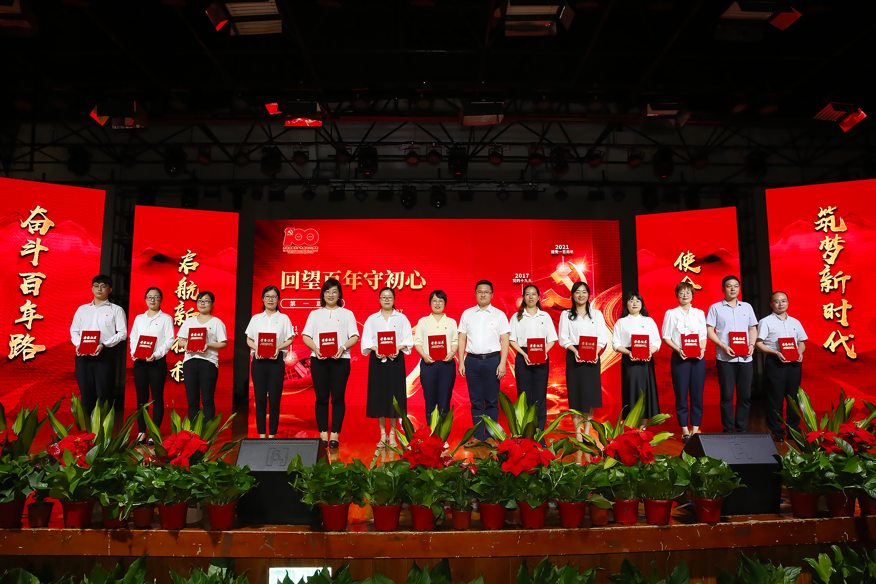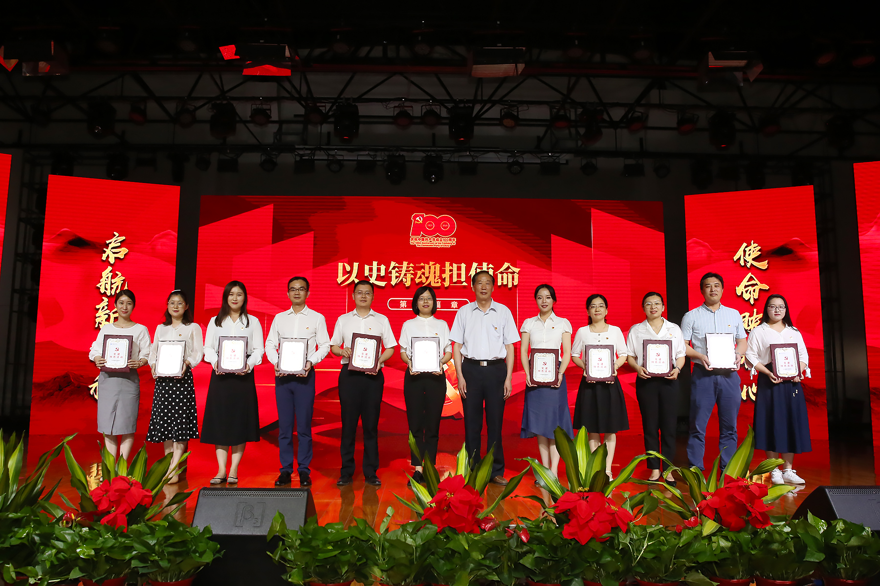 表彰大会分为“回望百年守初心”“以史铸魂担使命”“追梦前行谱新篇”三个篇章。