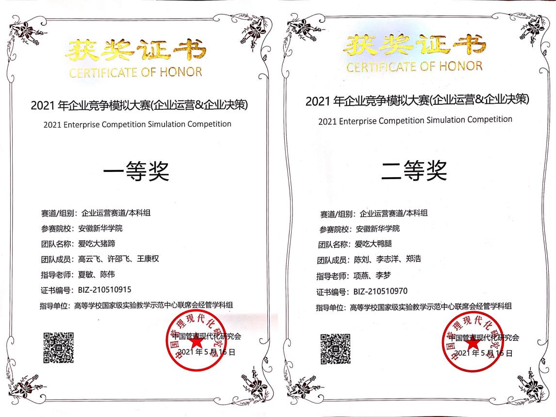 贝博官网学子荣获2021年全国企业竞争模拟大赛(bizwar)一等奖