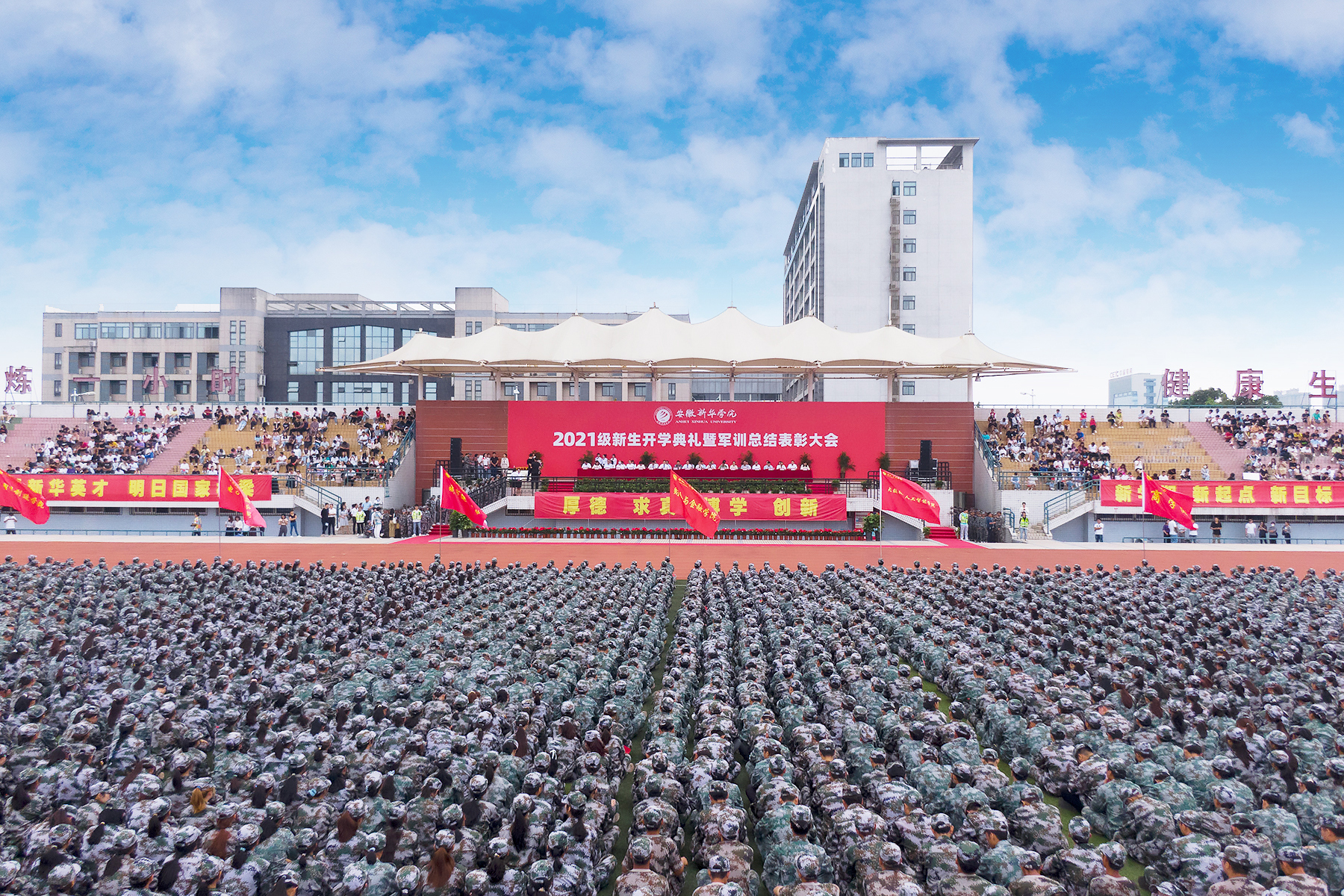 此次开学典礼暨军训总结表彰大会为军训画上了完美的句号。艰苦的军事训练,让新生们少了份柔弱娇气,多了份坚强勇敢,增强了的集体主义观念,为今后的学习和生活奠定了基础。梦想之路已经启程,希望同学们秉承“厚德、求真、博学、创新”的校训精神,志存高远,敢于担当,爱国爱校,尊师重教,知行合一,立志成才,甘于奉献,勇于创新,做一个守纪、诚信、明礼、文明的当代大学生!