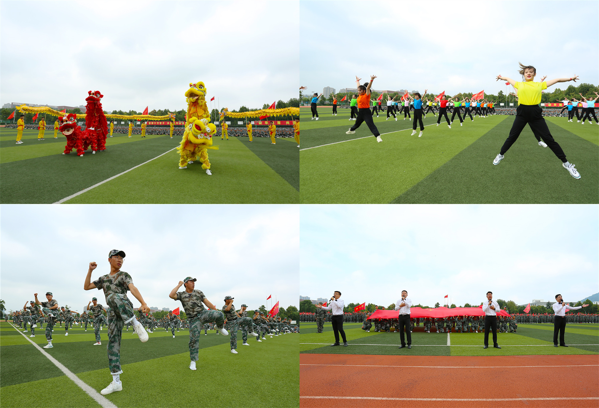 接着,一段气势恢宏的舞龙舞狮表演《龙腾新华》将现场气氛点燃,响彻祥云的口号,快速敏捷的动作,魁梧有力的出拳,代表着专属新华园的力量!跃动的舞蹈《骁》和激情飞扬的动作展现出新华学子的青春活力。《给力青春》响起,感动和震撼久久回荡。歌曲《红旗飘飘》压轴出场,青年教师代表深情献唱,鲜艳的巨幅五星红旗映在蓝天之下,全体新生挥动着国旗,怀揣赤子之心,表达着对党和国家由衷的热爱!
