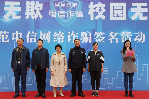 本网讯(通讯员:赵影、朱格格)正值“双十一”购物节来临之际,为进一步提高全校师生防范电信网络诈骗意识,杜绝诈骗事故发生,创建平安和谐的校园环境,11月5日中午,全校防范电信网络诈骗签名活动在图书馆南广场举行,校长助理邵玲、高新派出所所长潘骏、学生处副处长(主持)郑妮、药学院执行院长黄德垚、保卫处副处长(主持)仇陶以及各二级学院师生代表,活动由药学院院长助理汪涵涵主持。