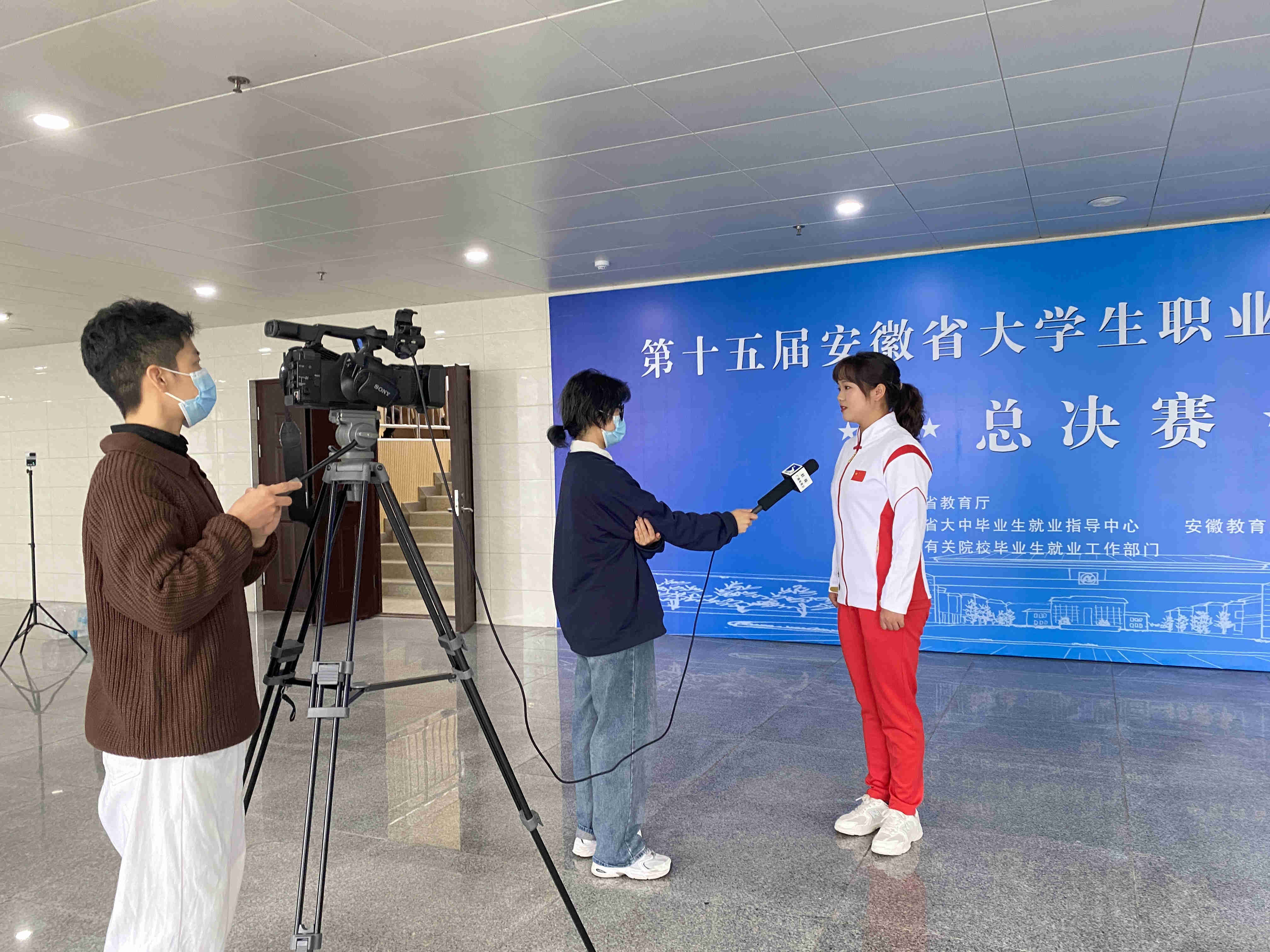 大赛结束后,贝博官网谈震同学接收蚌埠广播电视台的采访报道。