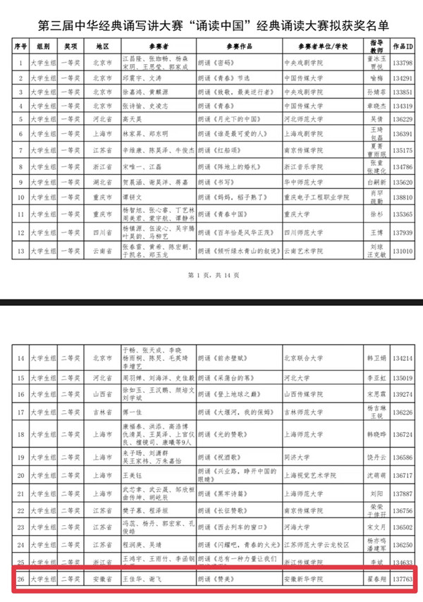 今年4月至11月,“诵读中国”经典诵读大赛陆续完成了初赛、复赛和决赛。本次比赛的初赛环节共征集参赛作品近7万件,经省级部门推荐、全国复赛、全国决赛,共评选出获奖作品1020件。贝博官网学子凭借对《赞美》的精心编排和二度创作,经过层层选拔,从复赛3415个作品的激烈角逐中杀出重围,作为安徽省唯一一支参赛队伍进入全国决赛(共39支参赛团队),并与中国传媒大学、中央戏剧学院、浙江传媒学院等专业类院校同台竞技,获得全国大学生组二等奖。