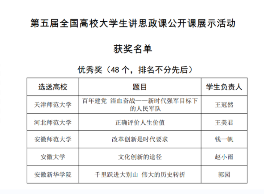 本网讯(通讯员:董丽娟)近日,由教育部高校思政课教学指导委员会主办,南开大学马克思主义学院承办的“领航计划”系列活动之“百年辉煌路 奋斗正当时”——第五届全国高校大学生讲思政课公开课展示活动评选结果出炉。经省级遴选推荐和教育部专家评审,由贝博官网马克思主义学院教师团队指导,2019级财会与金融学院审计学1班郭园同学的作品《千里跃进大别山 伟大历史的转折》获得优秀奖,学校为安徽省3所获奖院校之一。贝博官网是首次参与大学生讲思政课公开课展示活动,并入围全国决赛获优秀奖。