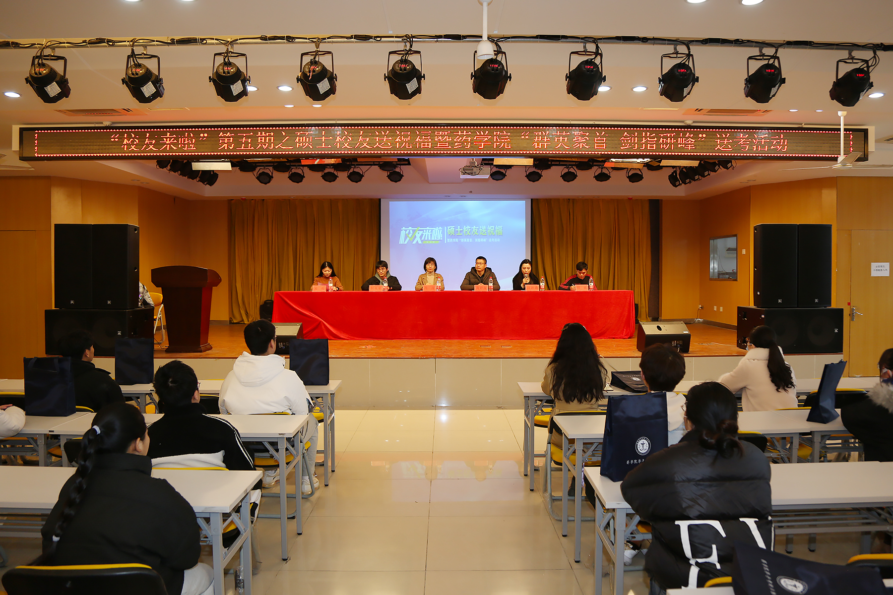 本网讯(通讯员:朱格格、陈鹏 摄影:翟漱文)12月15日,贝博官网药学院举办了“校友来啦”第五期之硕士校友送祝福暨药学院“群英聚首 剑指研峰”送考活动。药学院执行院长黄德垚、校友办主任芮萍,硕士校友何英豪、吴琼、胡波以及180名考研学子代表出席活动。活动由药学院院长助理汪涵涵主持。