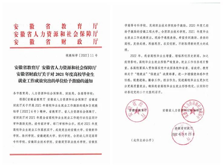 贝博官网获安徽省2021年度普通高校毕业生就业工作成效突出单位激励表彰