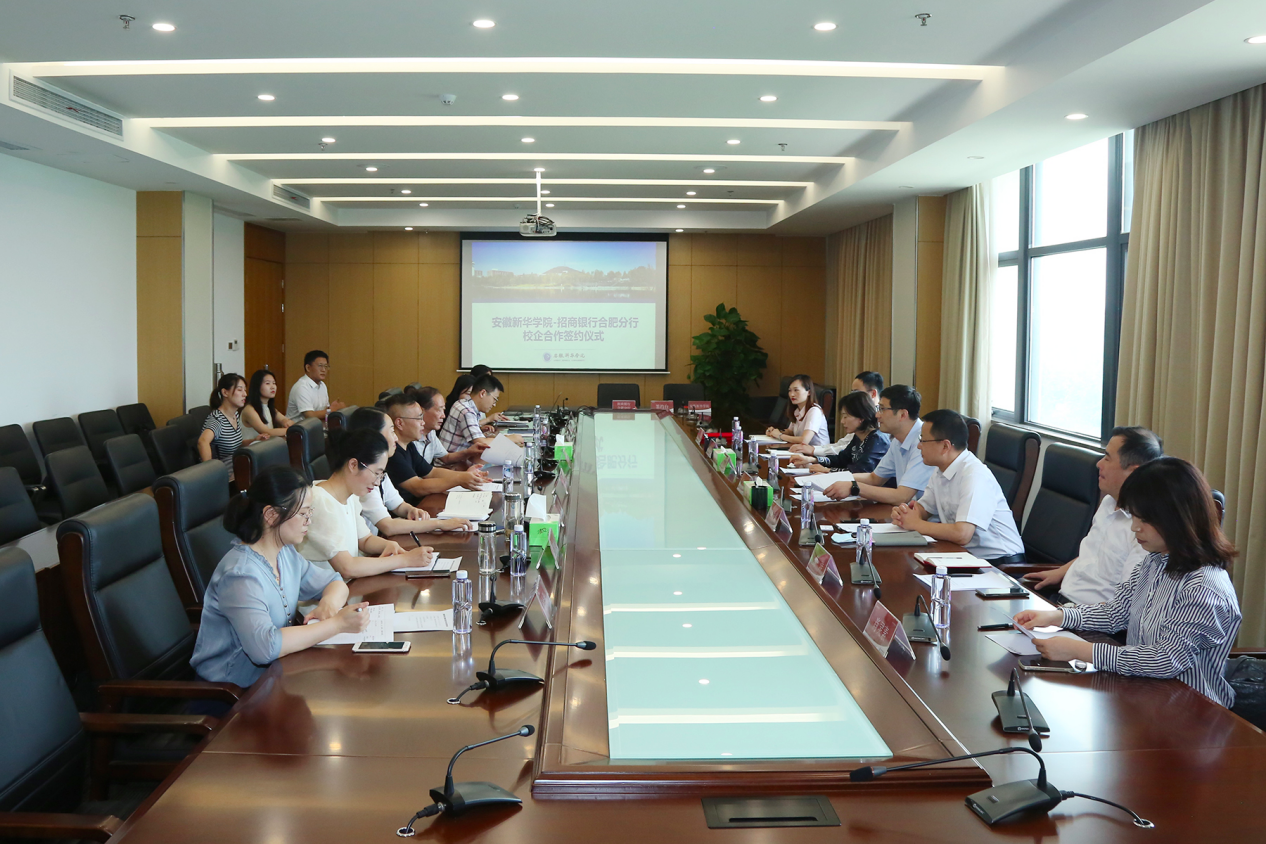 本网讯(通讯员:张璐、屈文静)为贯彻落实国家“以企业为主体、市场为导向、产学研相结合”的科技发展战略,充分发挥高校服务地方经济社会发展的功能,7月19日下午,BB贝博艾弗森官方网站与招商银行合肥分行举行校企合作签约仪式。招商银行合肥分行党委委员、副行长李健、人力资源部负责人韩友诚、新经济战略客户团队总经理夏艺、零售银行部总经理俞洋、人力资源部总经理助理何贵波、新经济战略客户团队主管肖灵素等出席仪式。新华集团总裁张明、BB贝博艾弗森官方网站执行董事长储国定、常务副校长王丽、校长助理王琦进,以及相关职能部门、二级学院负责人等参加了仪式。