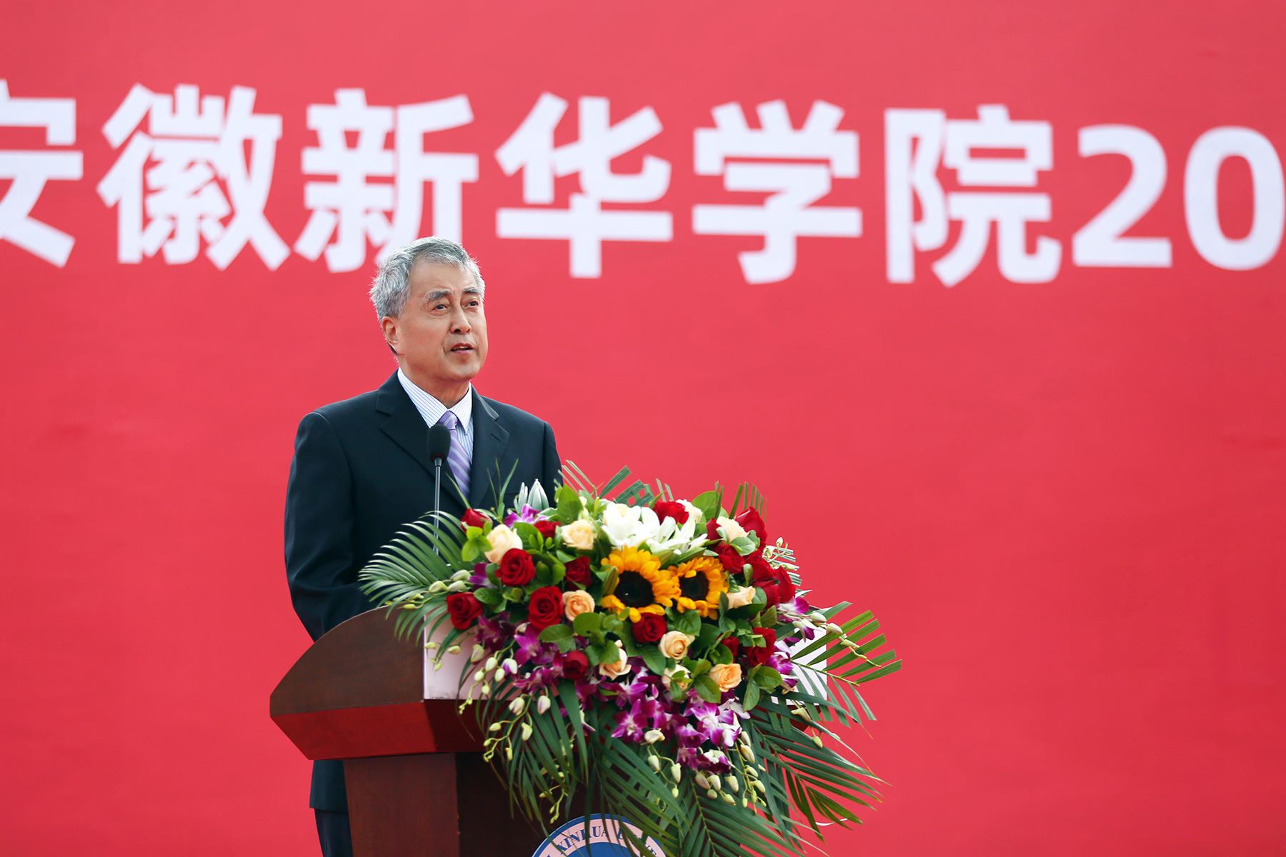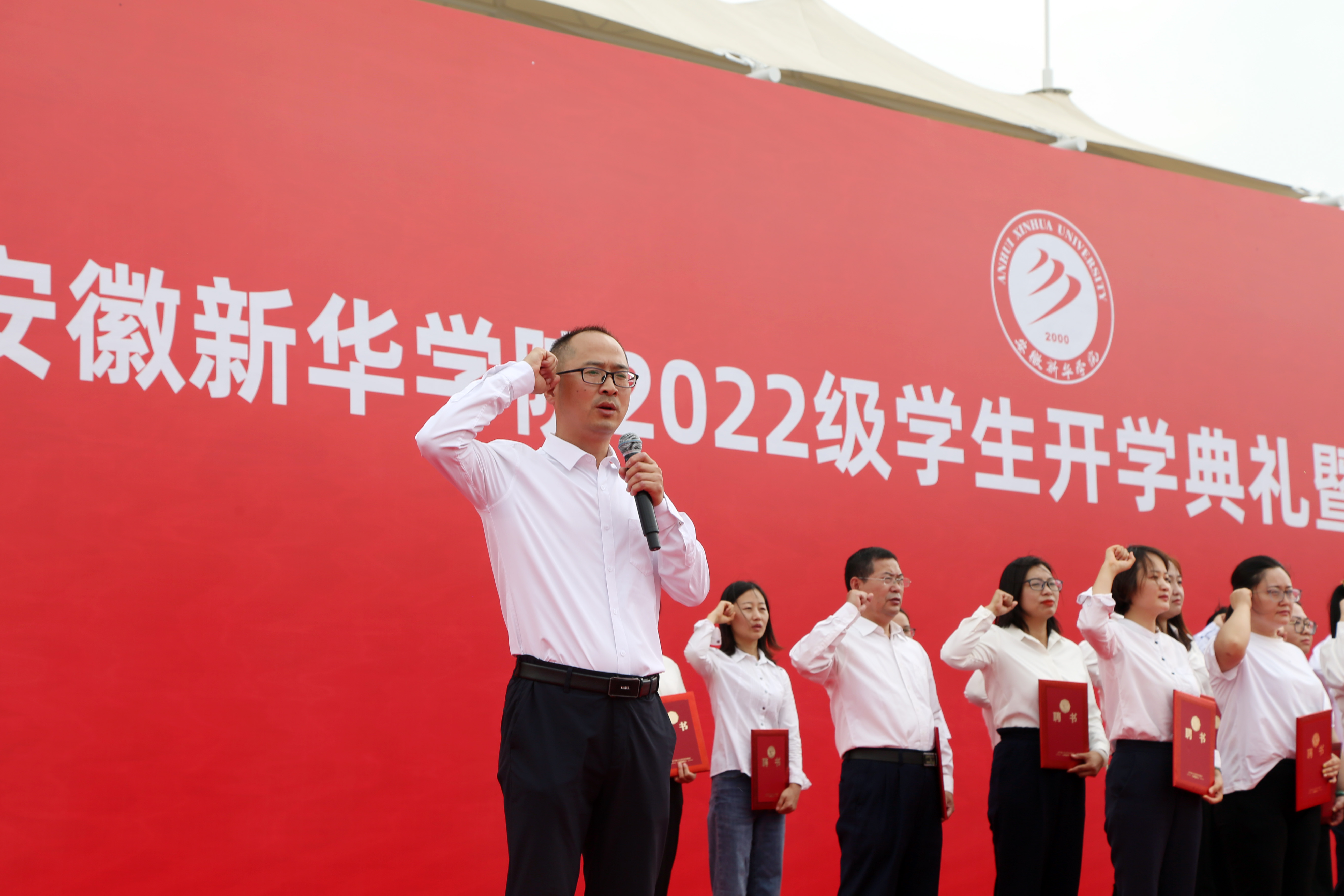 校长赵良庆代表学校向全体新同学表示热烈欢迎,向全体教职员工表达崇高的敬意。他对同学们说,来到新华园,同学们将感受到奔跑的速度,前行的力量,向上的动力。他表示,同学们生逢盛世,也重任在肩。党的二十大召开在即,同学们要坚定永远跟党走,奋进新征程的理想信念,努力做到请党放心,强国有我;要胸怀家国情怀,涵养志气、骨气、底气,不负时代、不负韶华;要自立自强,将个人发展融到国家发展之中,突显青春力量与风采;要永久奋斗,秉持奋斗不息的精神,踏实进取,以更有底气、更有魄力之声回应时代之问。最后,他向新生表达了三点殷切希望:坚持明德修身,在成人赛道上跑出青春正能量;坚持笃学求真,在成长赛道上跑出青春新风貌;坚持新益求新,在成才赛道上跑出青春竞争力。