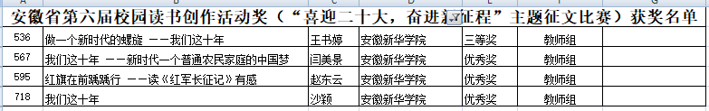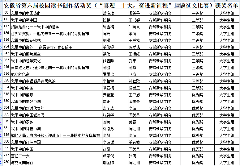 本网讯(通讯员:王青叶)由省委教育工委、省教育厅、省人力资源和社会保障厅、省文化厅、省新闻出版广电局、团省委主办的安徽省第六届校园读书创作系列活动结果公示结束。贝博官网共获奖27人,其中一等奖1人,二等奖4人,三等奖8人,其余为优秀奖。 获奖名单如下: