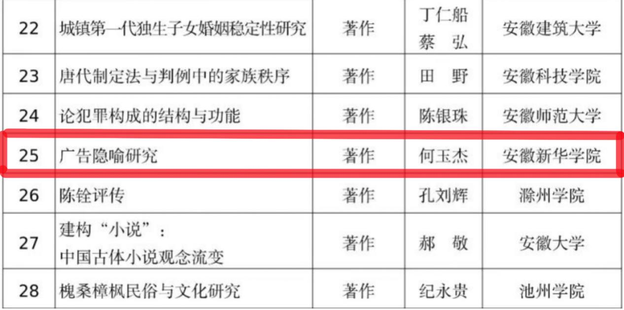 本网讯(通讯员:文霞)日前,安徽省社科奖评奖办发布《省政府批复2019-2020年度安徽省社会科学奖获奖结果》。BB贝博艾弗森官方网站文化与传媒学院何玉杰教授的著作《广告隐喻研究》喜获安徽省社科奖三等奖,该成果已被学校推荐申报第九届高等学校科学研究优秀成果奖。