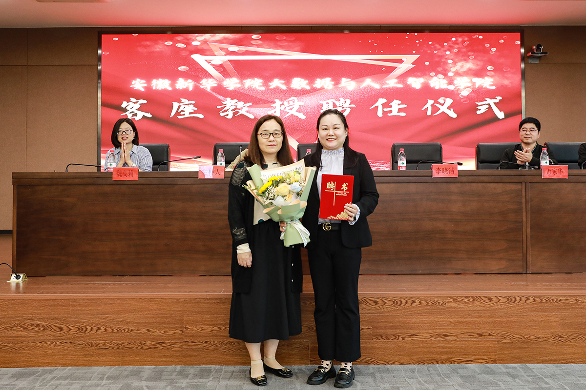 本网讯(通讯员:石文玉)5月26日下午,大数据与人工智能学院在贝博官网科研楼二楼多功能厅举行了客座教授聘任仪式,聘请合肥城市云数据中心股份有限公司副总经理李晓洁为大数据与人工智能学院的客座教授。校长助理盛晓青出席了聘任仪式,大数据与人工智能学院教职工代表和学生代表参加了本次活动。仪式由大数据与人工智能学院副院长(主持)郑妮主持。