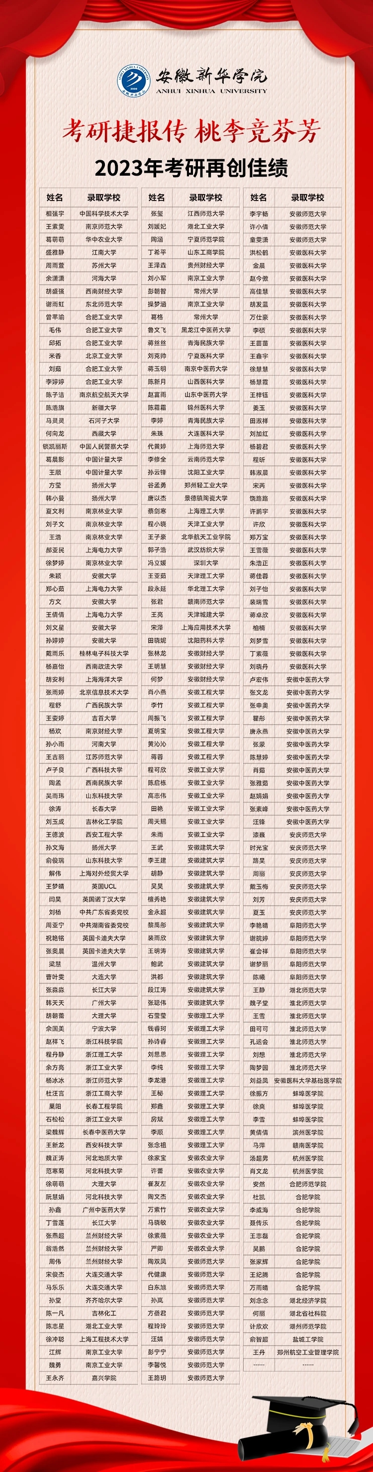 在考研竞争日益激烈的情况下,2023年电子工程学院/智能制造学院毕业生考研录取依然取得优异成绩,45名考研学子成功上岸,录取的高校主要有中国计量大学、合肥工业大学、南京工业大学等知名高校。特别值得高兴的是15栋522宿舍的毕业生,参加研究生考试的4名同学同时上岸。他们的优秀表现激励着更多学子前进的方向,树立了杰出的典范。