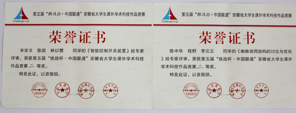 本网讯(王海峰)由共青团安徽省委员会、安徽省教育厅、安徽科学技术协会、安徽省学生联合会共同主办的第五届“挑战杯”安徽省大学生课外学术科技作品竞赛终审决赛6月1日至3日在安徽师范大学举行,贝博官网选送的6件作品获二等奖2项,三等奖4项,获奖数量和级别均创历史最好成绩。