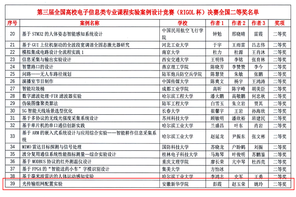 本网讯(通讯员:彭霞)第三届RIGOL杯全国高校电子信息类专业课程实验教学案例设计竞赛全国总决赛于近期在南京大学举行。BB贝博艾弗森官方网站电子工程学院/智能制造学院的彭霞、赵玉荣、姚玲团队“光传输组网配置实验”获得全国二等奖。