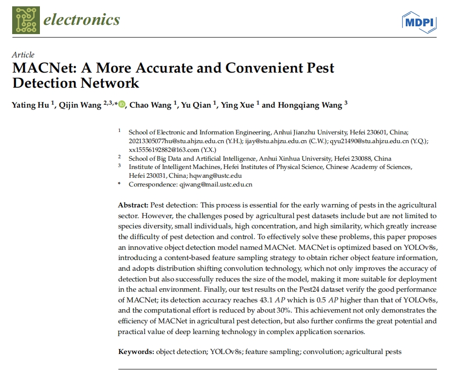 本网讯(通讯员:刘慧)近日,贝博官网人工智能目标检测研究团队王琦进教授的2021级硕士研究生胡雅婷以第一作者在SCI期刊《Electronics》在线发表了题为“MACNet: A More Accurate and Convenient Pest Detection Network”的研究论文(论文链接:https://doi.org/10.3390/electronics13061068)。据悉《Electronics》是国际知名期刊,JCR二区。