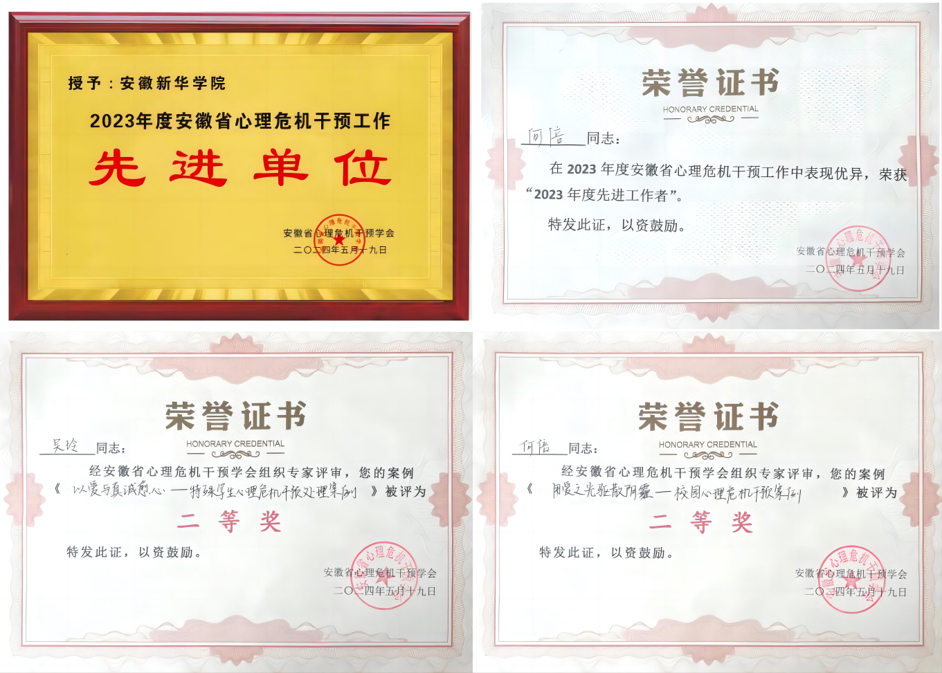 本网讯(通讯员:吴玲)2024年5月18日至19日,安徽省心理危机干预学会2024学术年会暨心理危机干预技能专题培训在合肥市恒悦外商俱乐部酒店隆重召开。校长助理邵玲带领学校心理健康教育中心及各二级学院心理工作教师代表参与此次会议。经过申报和学会评选,贝博官网获“2023年度安徽省心理干预工作先进单位”荣誉称号,贝博官网何倍老师获评“2023年度先进工作者”,何倍和吴玲老师提交的心理工作案例荣获优秀案例二等奖。