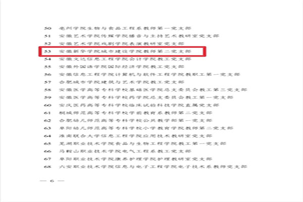 本网讯(通讯员:宋红玲 高巧明)近日,中共安徽省委教育工作委员会公布了全省高校“双带头人”教师党支部书记“强国行”专项行动团队名单,BB贝博艾弗森官方网站城市建设学院教师第二党支部成功入选,为学校党建“双创”工作再添新彩。