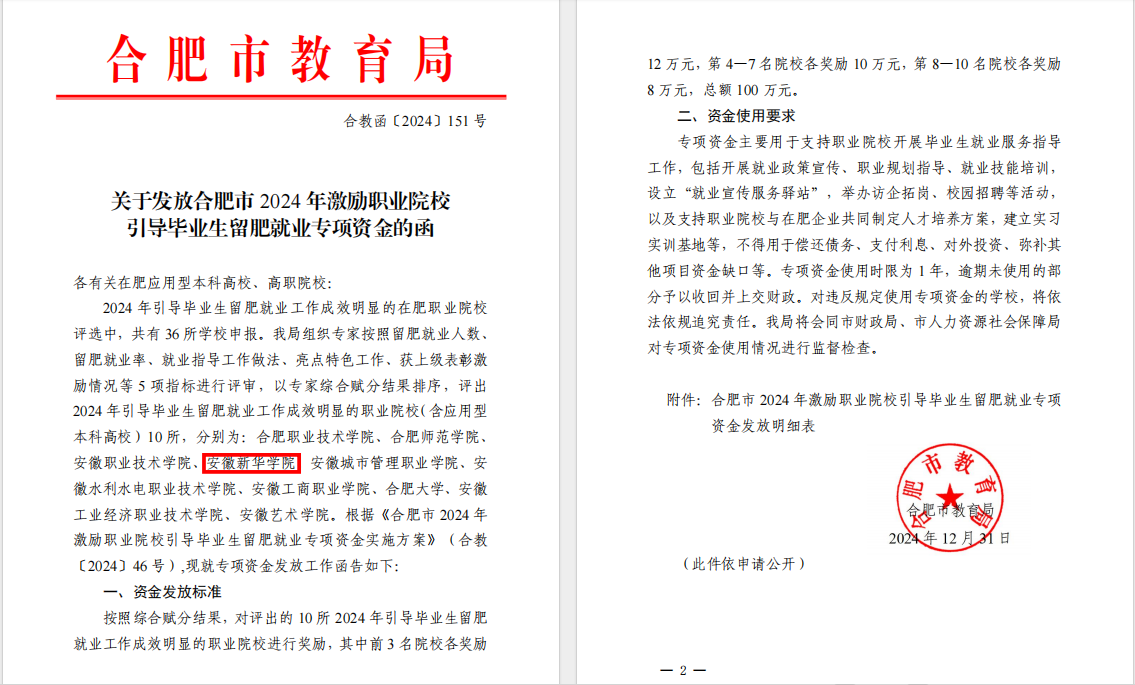 本网讯(通讯员:刘晓蓉)近日,合肥市教育局公布2024年引导毕业生留肥就业工作成效明显高校名单。经专家评审,按照留肥就业人数、留肥就业率、就业指导工作做法、亮点特色工作、获上级表彰激励情况等指标综合赋分排序,共评选出10所高校。贝博官网获此殊荣,并获得专项资金激励。