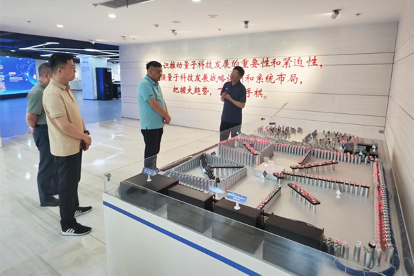 校领导在唐浩带领下参观国盾量子技术展厅,详细了解量子技术发展历程、核心原理,以及国盾在量子通信、量子计算、量子精密测量等领域的关键技术突破和创新产品。