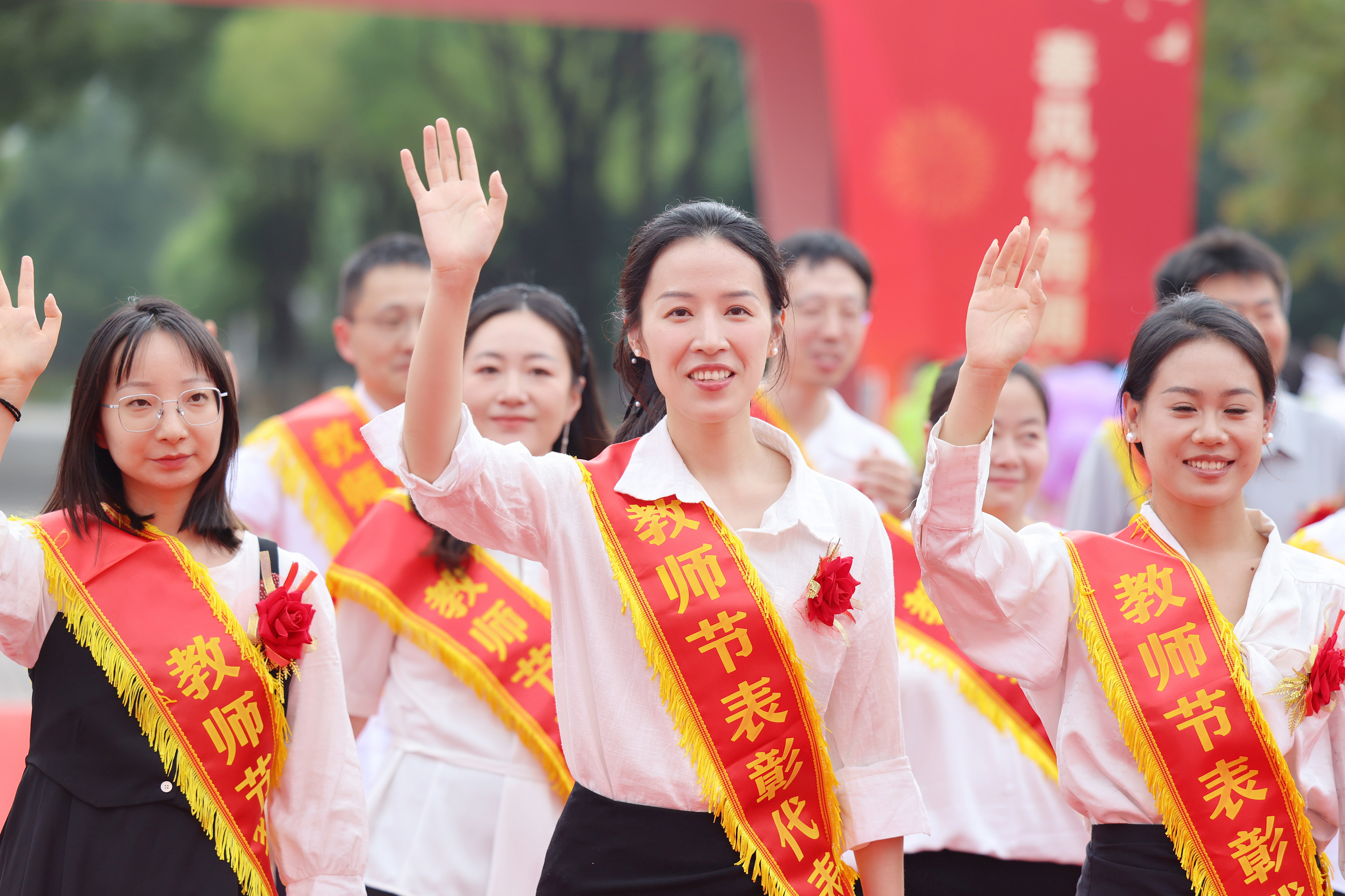下午1点,蜀麓广场气氛热烈,红毯“走秀”环节拉开了表彰大会的序幕。受表彰的教师们迈着自信从容的步伐,在师生们热烈的掌声和欢呼声中走过红毯,在签名墙前签名留念。