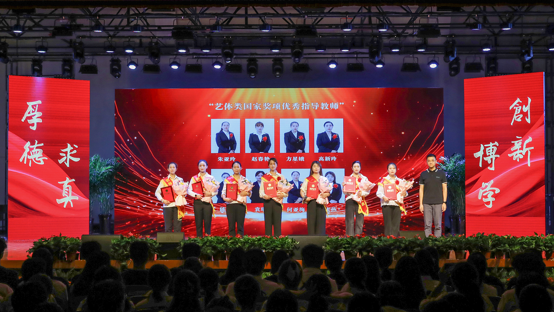 第一篇章聚焦教师在学科竞赛与艺体领域的引领作用,表彰在指导学生参与国家级赛事中屡创佳绩、为校争光的优秀教师。副校长盛晓青为“学科与科技竞赛优秀指导教师”颁奖;副校长王琦进、李军分别为两组“艺体类国家奖项优秀指导教师”颁奖。