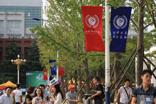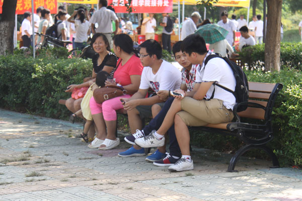 在这个阳光明媚的夏日里,2013级商学院财务管理专业的新生周旋,他的妈妈坐在上长椅上等待着孩子。周旋的妈妈在和记者的闲聊中这样说道:“从入校我就一直坐在这里等孩子报道回来,真的方便了我们这些陪送孩子报道的家长,重重的行李放在一旁,经过长途奔波,我们可以好好休息一下。”长椅就是新气象中的一项,简单、实用是它的特点。常春藤旗帜红蓝颜色的搭配显得庄严舒服,激活了校园的氛围。“厚德、求真、博学、创新”的校训醒人眼球。