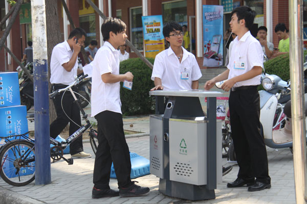 道路两旁的果壳箱也变换了新装,由原来的绿色不锈钢可移动的变装为双、单桶的固定果壳箱。总务处副处长宋翊表示,双单桶的分布是根据功能区的划分来安装的,保证学生聚集区的卫生清洁,方便学生杂物的处理,而双单桶的设计源自市政道路的垃圾桶设置。