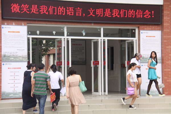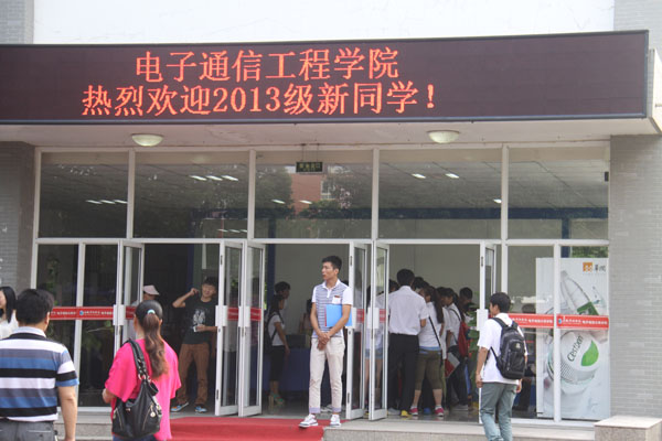 宿舍门前新安装的LED频上闪着“热烈欢迎2013级新生!”、“待人接物讲礼仪 行为举止讲文明”、“微笑是我们的语言,文明是我们的信念!”、“今天的选择,明天的成就,华园因你而精彩。”热情表达了学校对新生的欢迎,也给予了新生新的希望。2013级文化与新闻传播学院的新生陈静对宿舍内新安装的小型灯箱表示非常欢迎,不仅楼道明亮起来了,方便学生行走,更保障了学生的安全,也解决了怕黑女孩的一大心患。