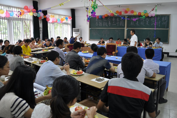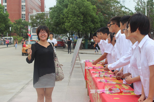 9月10日一早,当老师们走进教学楼里,同学们送上了鲜花和祝福的卡片。信息工程学院为迎接教师节安排了系列活动,为老师们精心安排了井雅萍博士为全院教职工做名为《计算机测量语言(兼谈科研团队的建设)》的讲座,并为老师们准备了小礼物。2011级信息管理与信息系统专业的学生为辅导员老师精心准备了节日礼物。他们召开主题感恩会,将两年来与潘祖中老师相处的点滴制作成纪录片,欢送调往商学院工作的潘老师,欢迎新任辅导员陈红老师,班级营造了很浓的感恩氛围。活动在全班同学《再见》的歌声中画上圆满句号,青春的正能量在这个节日里传递给每位师生。