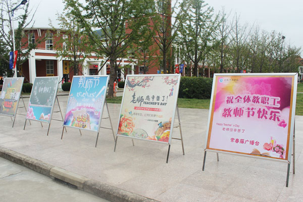 此次教师节感恩活动除了为老师献鲜花和向老师敬礼外,校团委还安排校学生会、青年志愿者协会、学生社团管理委员会、大学生记者团等学生组织、社团,共做出了11面教师节主题的海报,在图书馆前一字排开进行展示。