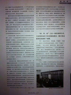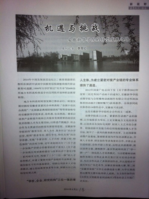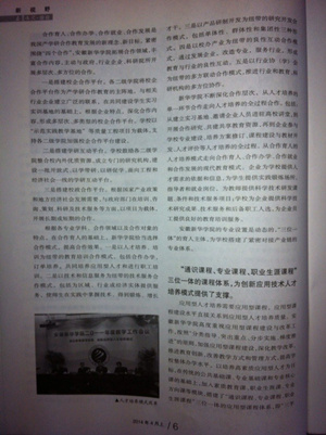 2014年4月上总第175期的《教育文汇》杂志在新视野栏目中刊登了关于BB贝博艾弗森官方网站转型发展的文章。文章指出,转型发展对BB贝博艾弗森官方网站来说,是机遇,也是挑战。学校在坚持“学校、企业、研究机构”三位一体的育人主体,建立紧密对接产业链的专业体系; 建立“通识课程、专业课程、职业生涯课程”三位一体的课程体系,创新应用技术人才培养模式; 构建“学、用、创”三位一体的培养方式,加强实验实习实训基地建设、建立创业教育体系等方面探索出自己的转型发展之路。
