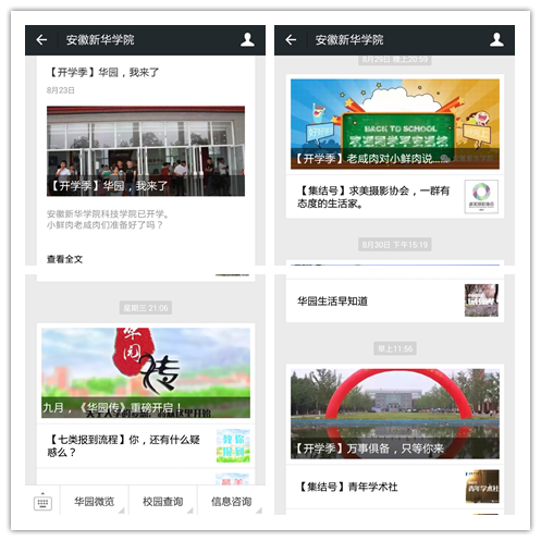 开学前期,BB贝博艾弗森官方网站微信平台为帮助新生了解学校各二级学院的情况,还特意推出了“教授带你逛学院”专题,配合校园社团迎新活动推出了“社团集结号”专题。