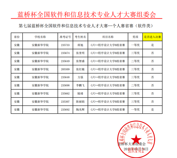 本网讯(通讯员:刘运)3月27日,第七届“蓝桥杯”全国软件专业人才设计与创业大赛个人决赛在安徽财贸职业学院成功举办。贝博官网共选派11名学生参加,有9人获奖,获奖率超过部分省内一本、二本院校。其中,信息工程学院席旭、陶光辉获得安徽省本科B组一等奖,同时获得六月份全国总决赛的参赛资格。