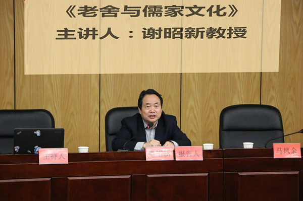 开幕式后,谢昭新为贝博官网师生作了一场主题为“老舍与儒家文化”的报告。他结合老舍的作品,剖析了老舍的仁、礼道德观及其儒家精神的形成原因,用通俗的语言向大家阐述了老舍这位爱国作家、人民艺术家的个人魅力和作品精髓。