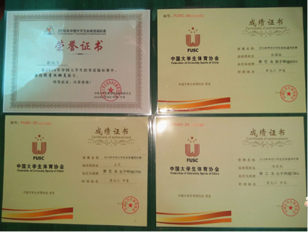 据悉,本次比赛由中国大学生体育协会主办,黑龙江省伊春市教育局、体育局承办。比赛历时7天,共有来自全国118所高校的906名运动员参赛,贝博官网代表队派张国栋、杭讯飞、李涛、王芃、陈丽朵五名队员参赛。张国栋、王芃两位同学顽强拼搏,最终分别获得男子甲组80KG级第五名、甲组女子57KG级第五名的好成绩。陈丽朵在女丙73KG的比赛中表现突出,第一轮比赛中轻松获胜,在第二轮半决赛上发挥出色,连续进攻,以14:8大比分挺进决赛,最终荣获亚军。