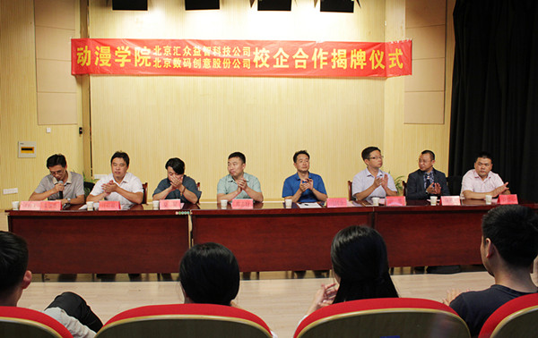 本网讯(通讯员:朱诵贵,摄影:李素萍)9月21日下午,动漫学院与北京汇众益智科技集团、北京创意科技股份有限公司的校企合作揭牌仪式在新闻演播厅举行。副校长马凤余,动漫学院执行院长计勇,副院长朱诵贵、许存福,北京汇众益智科技集团全国市场总监邢志财、策划总监鲍鹏杰、合肥分公司总监许建军,北京创意科技股份有限公司漫果工作室经理夏冕等参加了揭牌仪式。