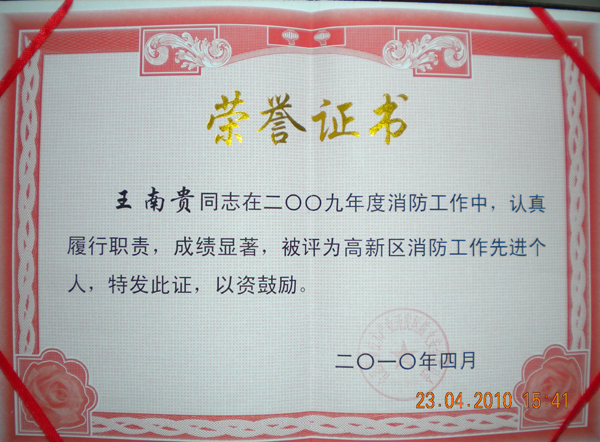 会上隆重表彰了高新区2009年度10家消防工作先进单位和28位先进个人。我院喜获“高新区2009年度消防工作先进单位”荣誉称号,保卫处王南贵同志荣获“消防工作先进个人”。