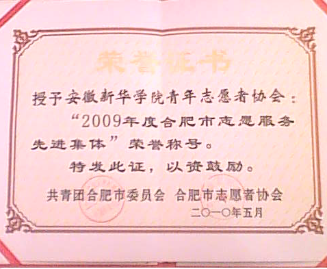 我院青年志愿者协会喜获“2009年度合肥市志愿服务先进集体”荣誉称号