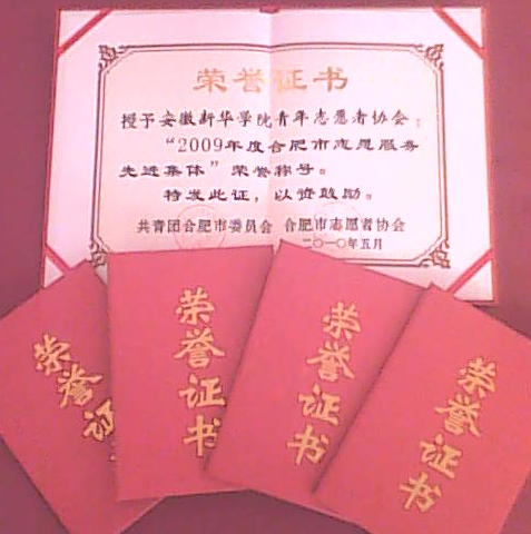 09年,我院青年志愿者协会在院团委的指导下,一直秉承尽己所能,不计报酬,帮助他人,服务社会,实践志愿精神,传播先进文化,为建设团结互助,平等友爱,共同前进的美好社会贡献力量的服务宗旨,积极开展了多项志愿服务活动。以实际行动实践了志愿服务精神,在华园甚至合肥市都赢得了强烈的反响,为推广志愿精神做出了贡献。