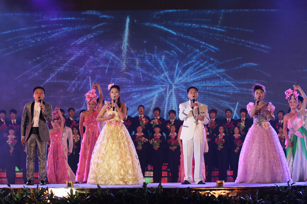 ( 晚间七时,伴随着隆隆震响和绚烂绽放的礼花,晚会正式拉开帷幕)