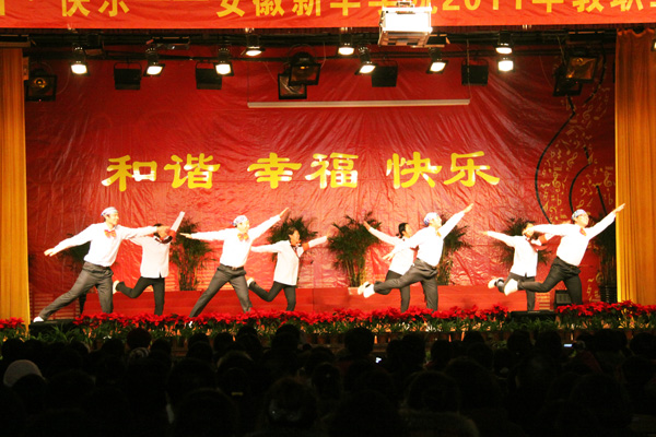 联欢会在开场舞《欢天喜地》中拉开了序幕,现场气氛热烈、喜气洋洋。整场联欢会精彩纷呈、其乐融融,现场充满了幸福、和谐、快乐的气氛。一首经典老歌《爱如潮水》带大家一同回味那段美好的青春岁月。《咏新华》、《神话》、《家春秋》、《第八套广播操表演》等众多精彩的节目让现场掌声不断、笑声不断。《非诚勿扰》、街舞表演、双簧等节目把联欢会推向了高潮。节目最后领导们与所有演出人员合影留念,共同唱响《新华之歌》,本场联欢会在一片祥和中落下帷幕。晚会现场还进行了抽奖活动。