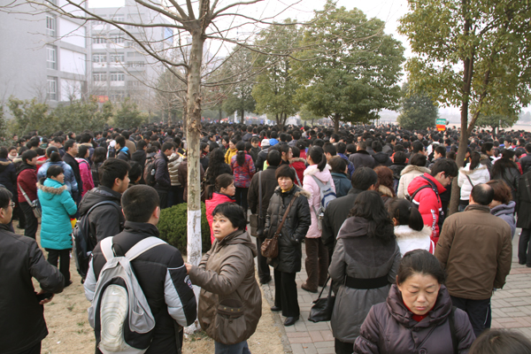 (三千余名考生在家长的陪伴下在考场外等候)