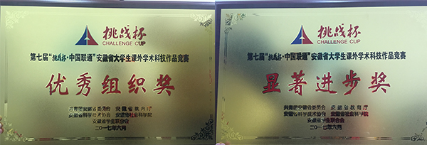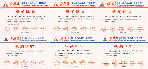 由朱诵贵指导的邢慧、刘雷、路坤龙、武文星、朱振伦、岳吻6位同学的作品《融合、传承、创新、保护,安徽省动漫产业发展提升思考》荣获一等奖,并首次入围“挑战杯”全国竞赛;由卫强指导的任定美、李四聪、孙涛、吕来虎、陈敏4位同学的作品《皖南野生红豆杉中活性多糖的制备及初步分析》和王梦芬、汪甜甜、陈燕3位同学的作品《天然去屑和养发固体洗发剂的研制》荣获二等奖;由金建指导的刘康、鲍观花、马莞悦、陈润、单苗苗、何梦花、黄凯、邓腾飞8位同学的作品《一种高精度体感交互式智能手势控制器》荣获二等奖;由王超指导的陈晨、梁莉莉、史妍妍、袁玲玲、吴海芳5位同学的作品《双职工子女代养,社会准备好了吗?——关于合肥市“托管机构”的调查报告》荣获三等奖;由陈业慧、谈玲珑指导的李泽鑫、宋子明、欧阳磊、李栋4位同学的作品《基于虚拟现实的无线遥控智能小车》荣获三等奖,贝博官网在本届大赛中的获奖数量和级别均创历史最好成绩。