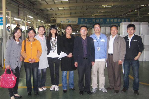 电子通信工程学院一行9位老师下午到达美的生产车间,受到了美的人事部经理马彪等人的热烈欢迎。随后在车间主任梁辉的带领下,老师们深入生产一线,了解整个车间及生产流程,并和实习学生进行了亲切的对接。
