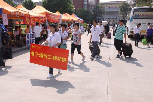 8月31日是八月最后一天,却是电子通信工程学院迎新的起航点。天空虽然下着雨,但电院所有迎新工作人员依然在伴着桂香的雨中尽着自己的职责,耐心地服务新生及其家长。参加迎新的学生志愿者在新同学一进校门就帮助搬运行李为他们引路、指导缴费、领生活用品、引进宿舍,为家长安排好茶水和休息室,为其存放行李,让他们安心、放心。那一张张洋溢着青春活力的笑脸汇成了华园的一道道亮丽的风景线。