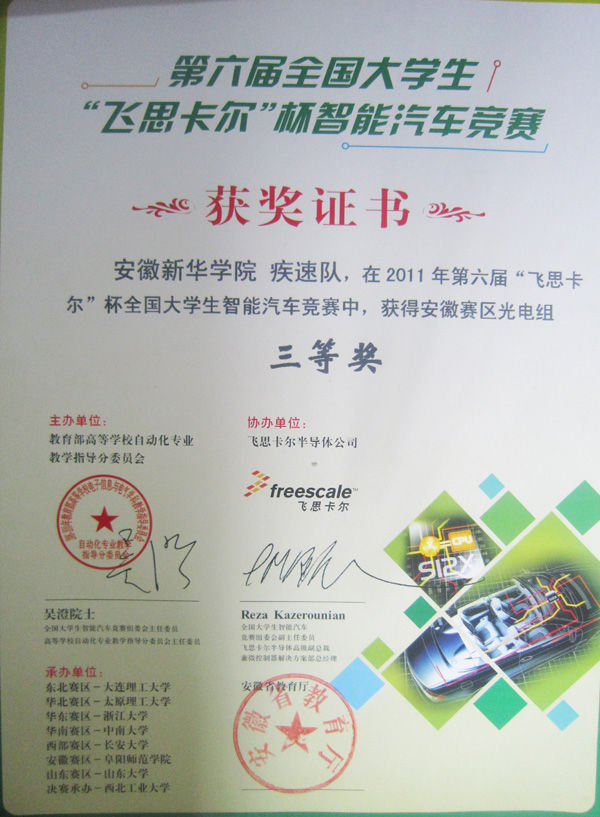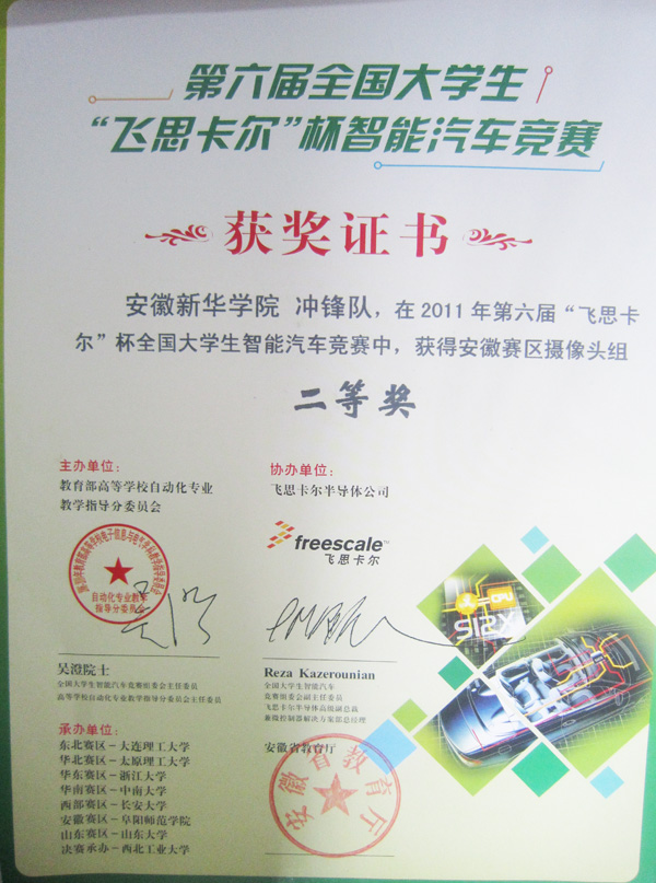 第六届全国大学生“飞思卡尔”杯智能车竞赛安徽赛区的比赛于7月15日到7月18日,在阜阳师范学院举行。电子通信工程学院学生代表BB贝博艾弗森官方网站参赛,喜获1个二等奖,1个三等奖的佳绩。近日,参赛选手已经拿到了获奖证书。