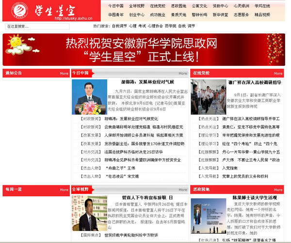 经过近半年的建设筹划,大学生思想政治教育专门网站“学生星空”于9月8日正式上线试运行,链接位于校园网首页主栏目上。