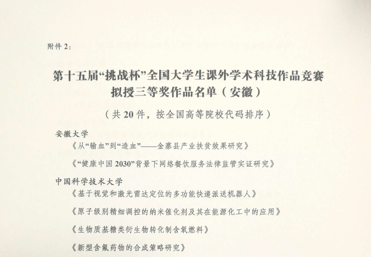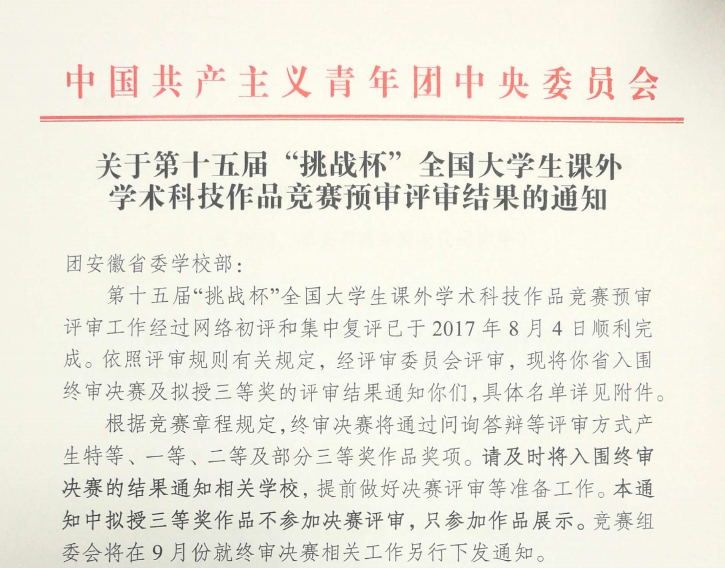 本届“挑战杯”自启动至今,全国各省、各高校积极组织响应。通过层层筛选以及省赛的激烈角逐,贝博官网学子的参赛作品以安徽省“挑战杯”一等奖的资格进入本届全国“挑战杯”大学生课外学术科技作品竞赛。在指导教师的带领和队员们的努力下,最终荣获佳绩。